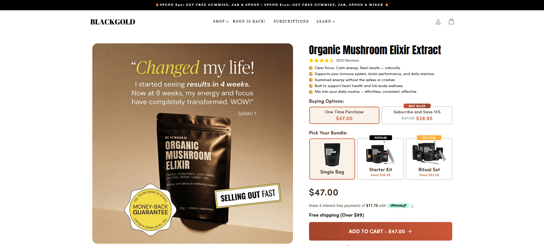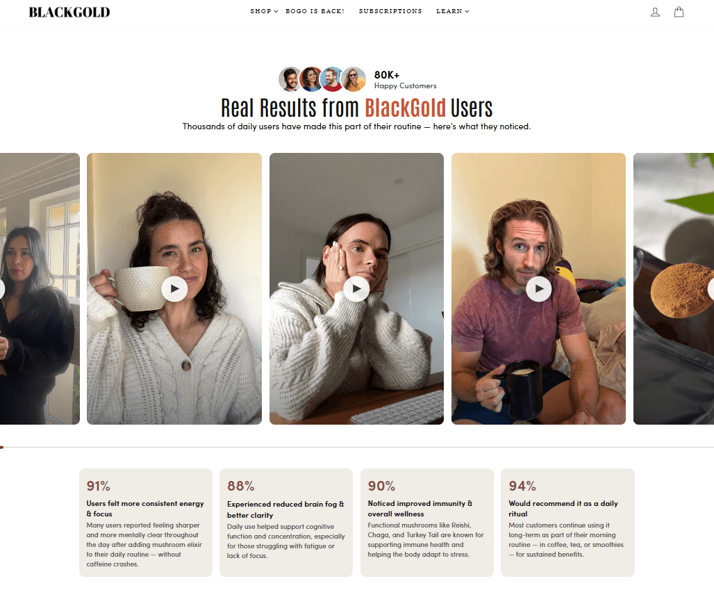 Black Gold Elixir is a wellness D2C brand built around one of nature's most powerful superfoods — functional mushrooms. Their hero product is a premium organic mushroom powder blend of six potent extracts: Chaga, Cordyceps, Lion's Mane, Maitake, Turkey Tail, and Reishi. No fillers, no caffeine, no fluff — just concentrated fruiting body extracts formulated for immunity, focus, and sustained daily energy. A product that genuinely works, backed by a growing wave of customers who swear by it. The product was solid. The traffic was real. The Shopify store, however, was silently killing everything.